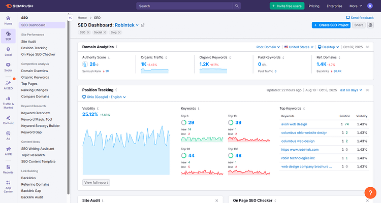 At Robintek, we’re passionate about helping businesses grow through smarter, data-driven digital strategies, and that’s why we’ve partnered with SEMrush, one of the industry’s leading search engine optimization and marketing analytics platforms. As an official SEMrush Partner, we leverage their powerful suite of tools to deliver measurable, long-term results for our clients. From local visibility to national rankings, our SEO team uses SEMrush daily to track performance, identify opportunities, and fine-tune strategies that keep our clients ahead of the competition.
